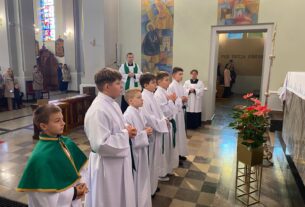 W kazaniu podczas mszy świętej ks. Michał przypomniał czym jest Eucharystia, a potem tłumaczył jej poszczególne elementy. Uczestniczymy w nabożeństwach od wielu lat ale nie zawsze symbolika i to co się dzieje wokół ołtarza jest dla nas zrozumiałe. Ks. Michał, jak zawsze po mistrzowsku, wyjaśnił znaczenie procesji na wejście – oddanie czci ołtarzowi i tabernakulum. Gest ucałowania ołtarza to najwyższa forma wyrażenia szacunku Bogu, który na nim się znajdzie (w relacji małżeńskiej pocałunek jest wyrazem miłości, podobnie i w kościele). Obrus na ołtarzu symbolizuje całun, którym było pokryte ciało Chrystusa. Mszę rozpoczyna ksiądz znakiem krzyża, czyli pokazuje, że całe nabożeństwo jest działaniem Trójcy Świętej. Pozdrowienie „Pan z wami” oznacza życzenie nam szczęścia ze spotkania z Bogiem. Odpowiedź ludzi „I z duchem Twoim” oznacza, że Bóg jest w duchu kapłana i że to Bóg, tylko rękami księdza, sprawuje ofiarę mszy świętej. Wyjaśnianie symboliki mszy zakończył celebrans znaczeniem aktu pokuty. Dalsze tłumaczenia będą za miesiąc na kolejnym spotkaniu pierwszoczwartkowym.