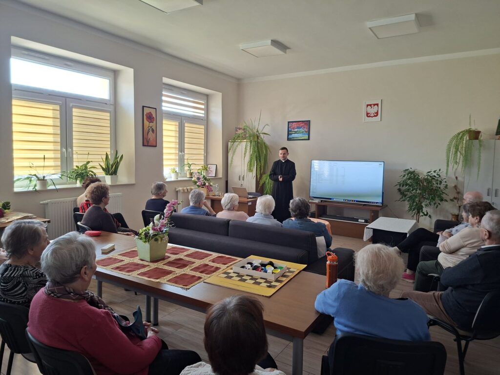 Spotkanie rozpoczęło się wspólną modlitwą, po której Seniorzy mogli dowiedzieć się ilu jest kapłanów misjonarzy pochodzących z naszej diecezji, gdzie posługują i jak ta posługa wygląda w codzienności. Obejrzeli również filmy i zdjęcia oraz figurki, które zostały przywiezione z krajów misyjnych. Całość spotkania przebiegła w bardzo dobrej i radosnej atmosferze. Seniorzy byli bardzo żywo zainteresowani tematem misji.